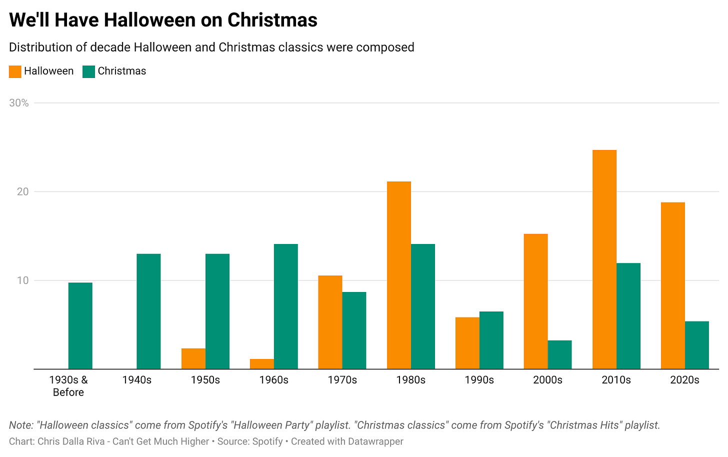 This is very different from Christmas music. If we compare the decade each song on Spotify’s Halloween Party and Christmas Hits playlists were composed, you’ll see that the musical traditions of each holiday are very different. According to Christmas Hits, 78% of well-known Christmas songs were composed before 1990. By contrast, only 35% of the songs on Halloween Party were written before 1990. In addition, most of those older songs were not written for the October holiday and are only being associated with the holiday because there aren’t as many options. Things may be changing, though.