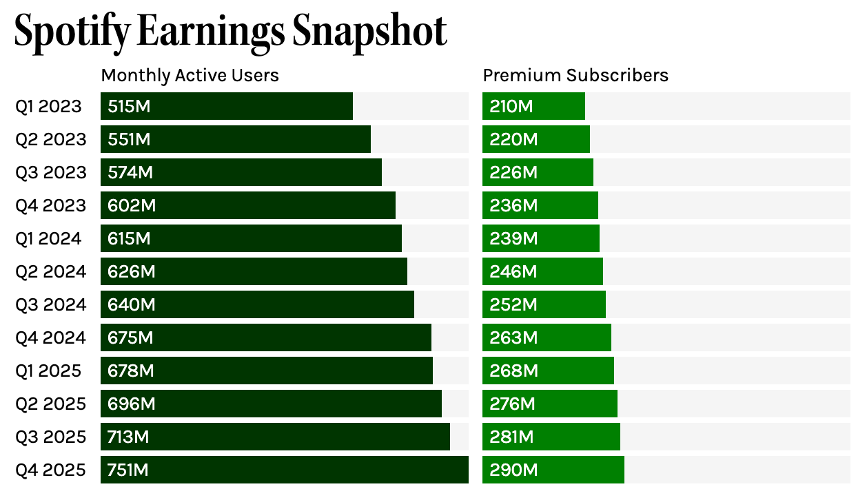 It was a good quarter for the music industry. Spotify added a whole lot of subscribers, and the company said they will continue to develop interactive musical experiences powered by AI, like their DJ feature. They claim to want to combat AI slop but have not been very specific on how they will do this.