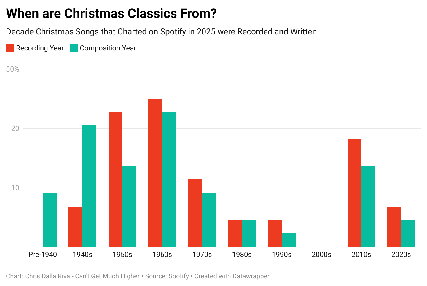 Also, if you’re still looking for a Christmas gift for that music lover in your life, pick up a copy of my book Uncharted Territory: What Numbers Tell Us about the Biggest Hit Songs and Ourselves. It’s a data-driven history of popular music covering 1958 to 2025.