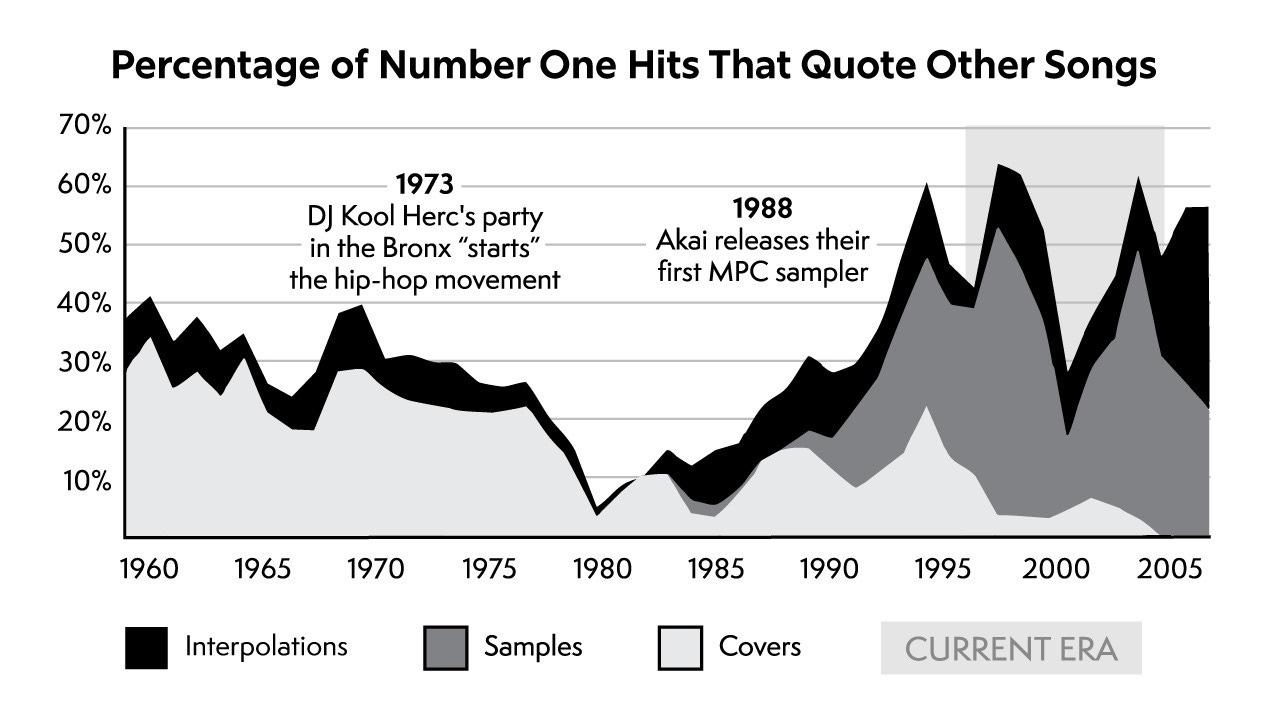 While repurposing existing recordings was an innovative, paradigm-shifting act, in a more abstract sense it fits with the evolution of other genre traditions. From the blues to country to jazz, songs have always been composed by quoting older works. We can see the evolution of these quotations through the number ones in Figure 10.5.