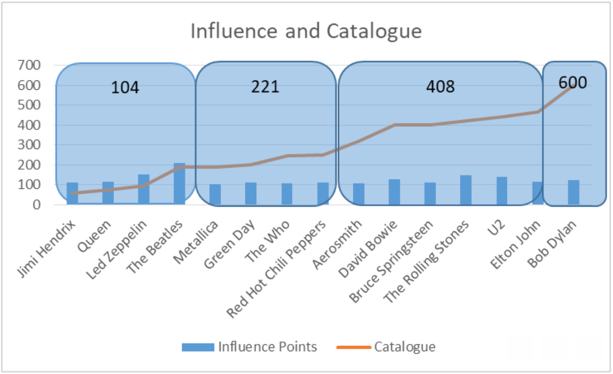 Last week’s post on the most influential rock bands got a ton of cool feedback. My favorite piece came from a reader who paired the influence scores with the number of songs that artist had released. Together those two pieces of information give you insight into which artists had the most influence in the shortest timeframe. In this case, Jimi Hendrix is a cut above the rest.