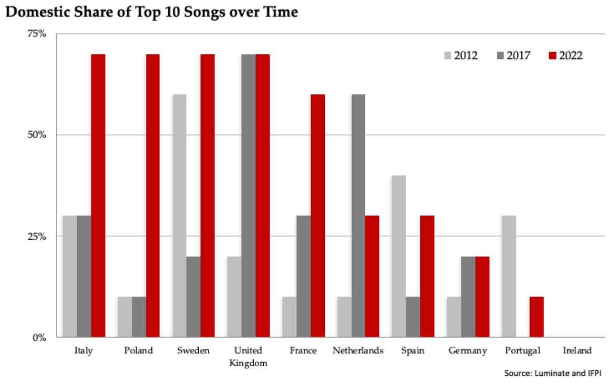 Let’s breakdown what’s going on here by looking at Italy. In 2012 and 2017, 3 of the top 10 songs on the year-end Italian chart (i.e., the most popular artists that Italian people were listening to) were by Italian artists. In 2022, 7 out of 10 were. This is a pattern we see in many European countries. As streaming has gone global, charts have gone local. Even in places where this effect doesn’t seem prevalent, like Spain, prove to have gone more local when we look closer.